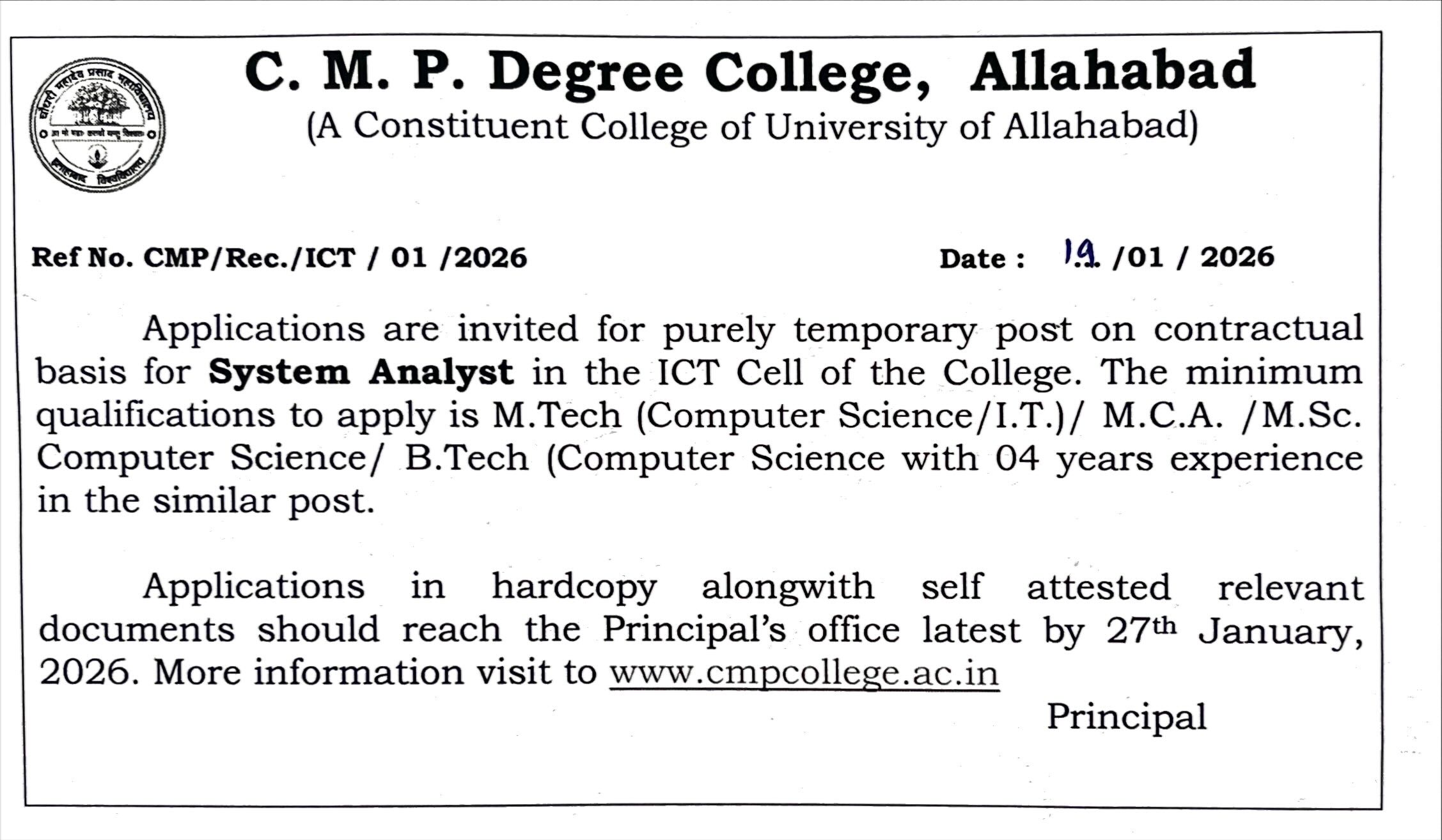 Applications are invited for one purely temporary post on contractual basis for System Analyst in the ICT Cell of the College. The Minimum qualification to apply is M.Tech. (Computer Science/IT)/MCA/M.Sc. (Computer Science)/B.Tech. (Computer Science with minimum 4 years of experience in similar post).