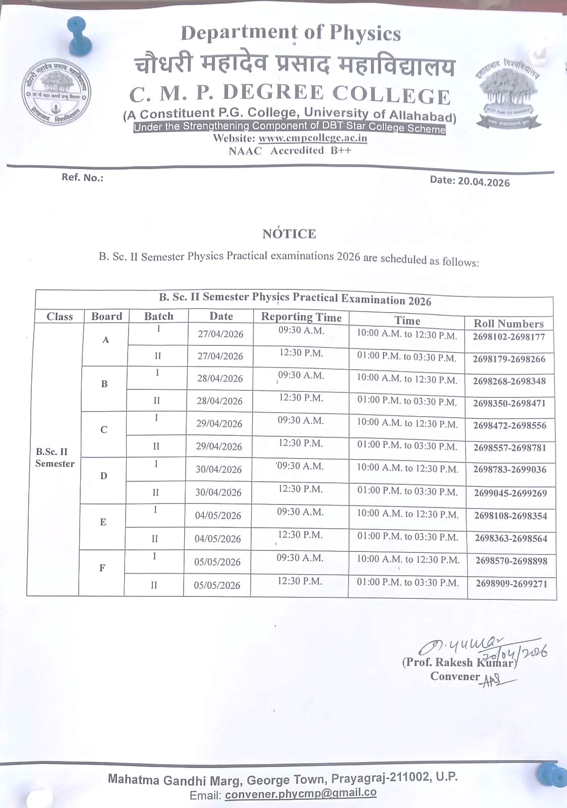BSc Second Semester Physics Practical Exam Notice